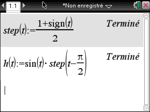 - Après le mini-test, j'ai fait au tableau la solution de quelques questions du test et j'ai fait un résumé au tableau du chapitre 6. J'ai fait le numéro 6.6 à la page 82. J'ai insisté sur l'utilisation de la commande solved( ) du package Laplace de Nspire pour résoudre l'équation et j'ai utilisé la fonction step(t) pour aider à tracer le graphe de la solution. Pour le reste du TP vous avez travaillé les exercices du cours 10, ou vous avez pu me poser des questions sur le devoir 3. Le 4e et dernier devoir sera disponible sur ce site au cours 11 mercredi.